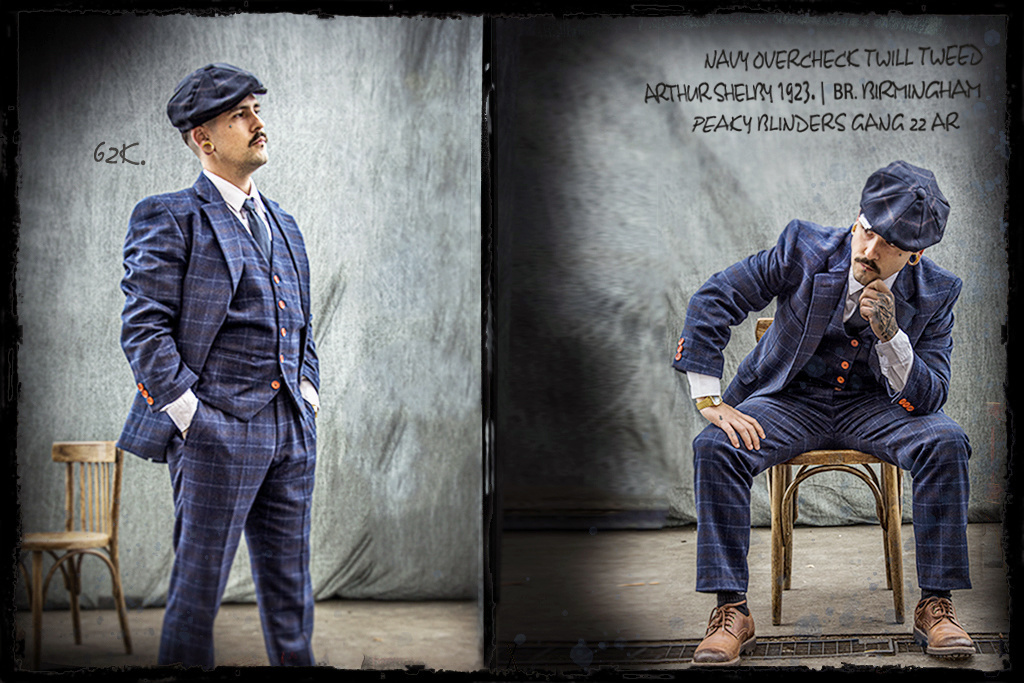 This fantastic Navy Overcheck Twill 3-piece tweed suit is modelled on Arthur Shelby, the troubled but tough eldest Shelby. The suit is made by tailors with great craftsmanship who’ll use your measurements to cut into a smart sleek fit. The authentic Prince of Wales tweed in deep navy make this suit perfect for both business and leisure. Or wear it at a great Peaky Blinders style wedding!