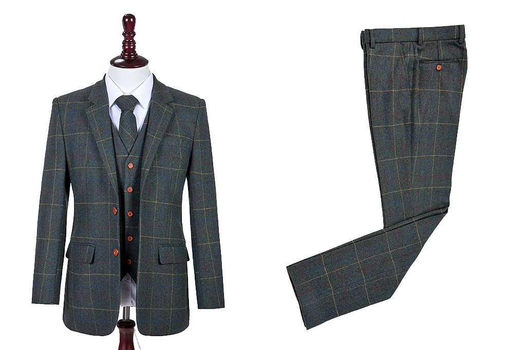 The Shelby Brothers collection offers 3 varieties of three-piece tweed suits, in different price ranges: