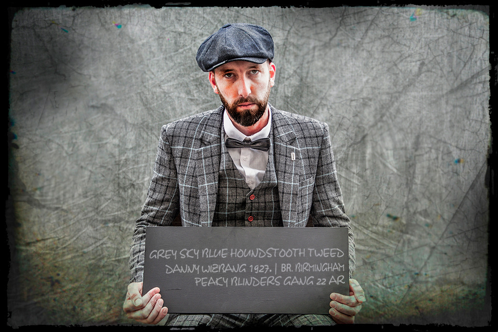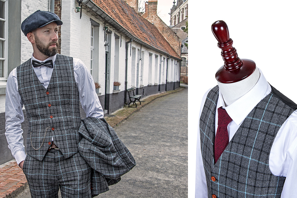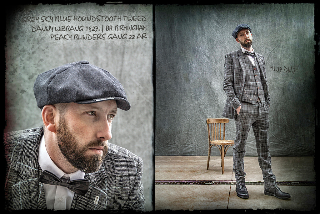 This Grey Sky Blue Houndstooth 3-piece tweed suit from our Shelby Brothers collection, is named after Danny Whizz-Bang and it’s handmade by tailors with great craftsmanship who use only English tweed of the best quality. They use your measurements to cut their fabrics, so your Shelby suit will fit perfectly. The original grey/blue tweed wool in Windowpane pattern guarantees an authentic 1920’s style look.