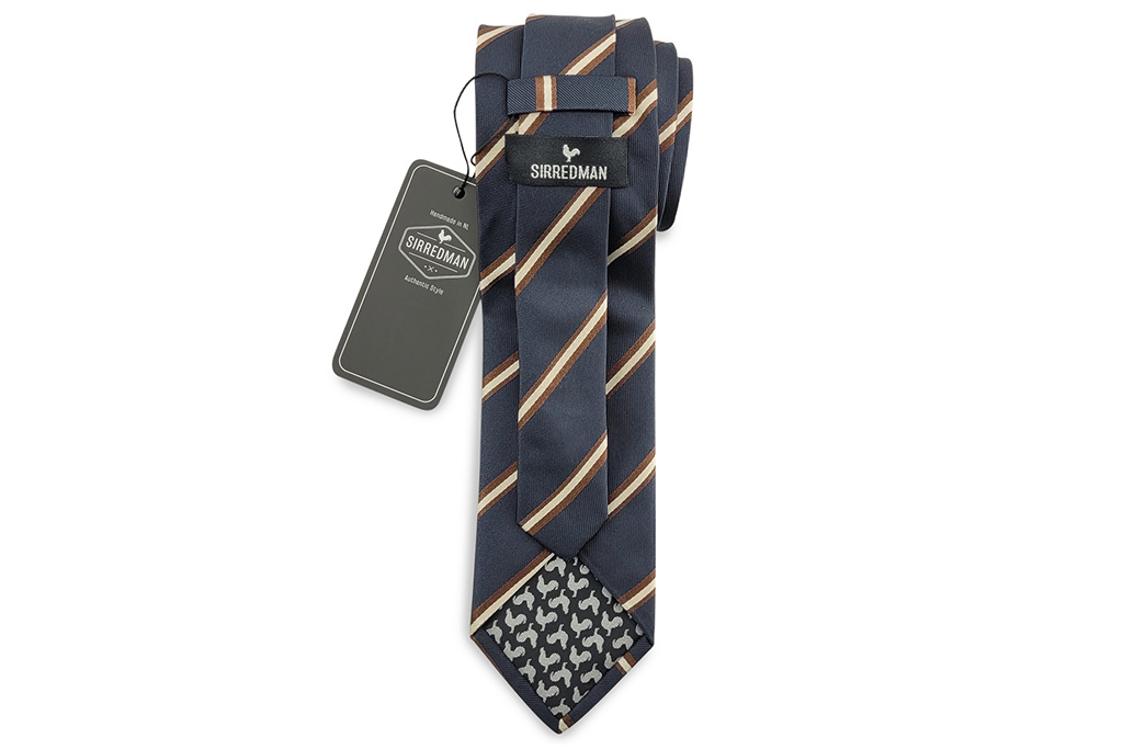 Made from 100% silk, Sir Redman's Regal Riccardo tie features a navy blue colour with diagonal stripes in brown and white. At 8 cm wide and about 144 cm long, it is the perfect choice for a formal or business look.