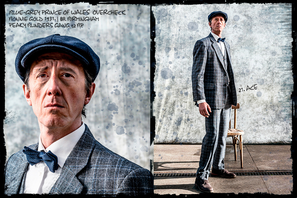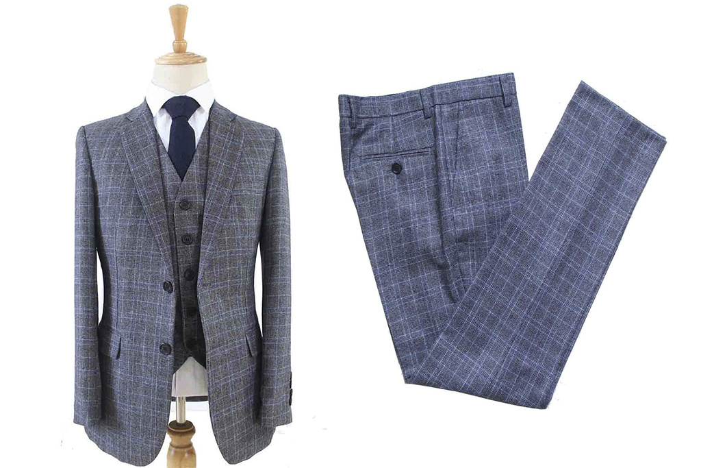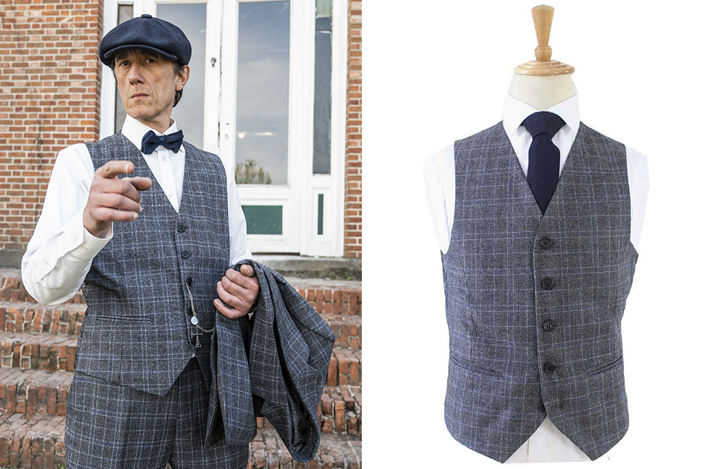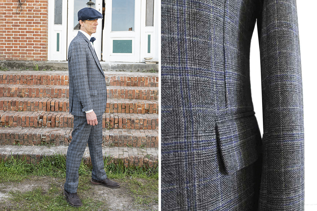 ¿Cómo de genial es el estilo de los Peaky Blinders y los hermanos Shelby? Estos hombres robustos están perfectamente vestidos hasta el último detalle. Este fresco y elegante traje en azul-gris con un bonito estampado clásico de cuadros viene de nuestra propia y exclusiva colección Shelby Brothers y consiste en una chaqueta, un pantalón y un chaleco en contraste. Y como el traje está hecho a medida para usted, está garantizado que le quedará bien.