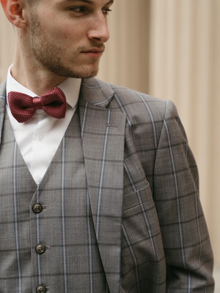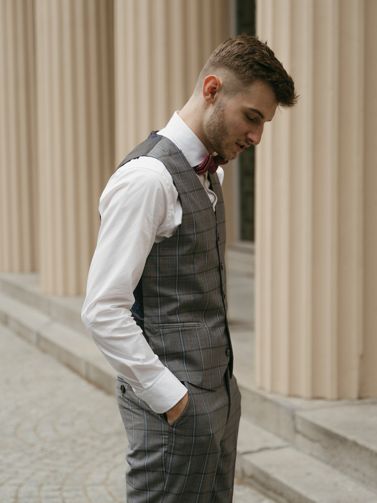 Elegante, como Michael Gray. Un traje gris de tres piezas en lana peinada con un patrón de cuadros grandes (windowpane) de nuestra propia colección de verano Shelby Brothers. Hecho de 100% lana peinada de alta calidad.