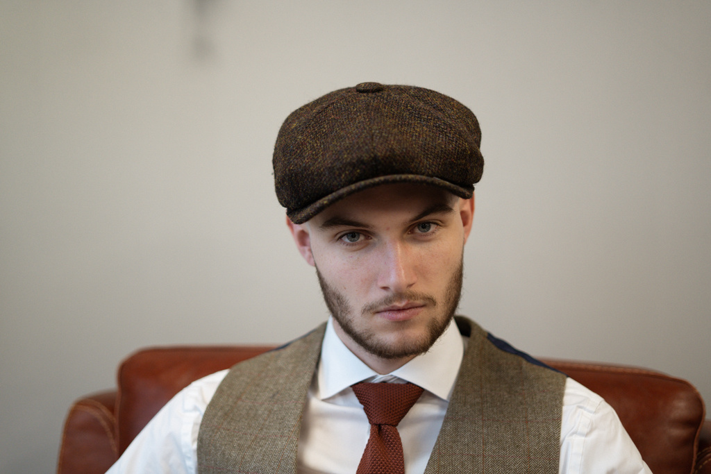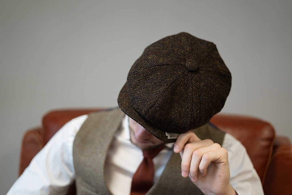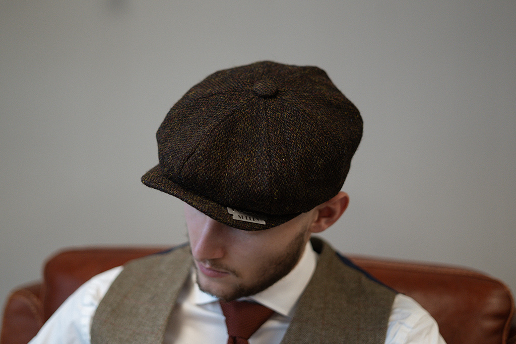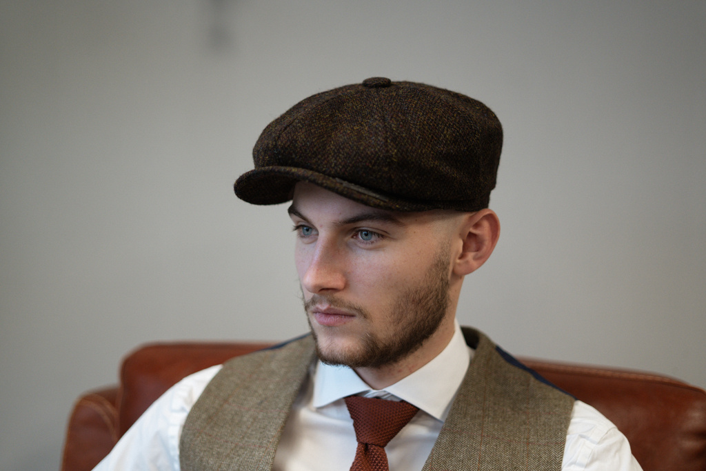 DescriptionCasquette Newsboy | Harris Tweed | 8 panneaux | Marron