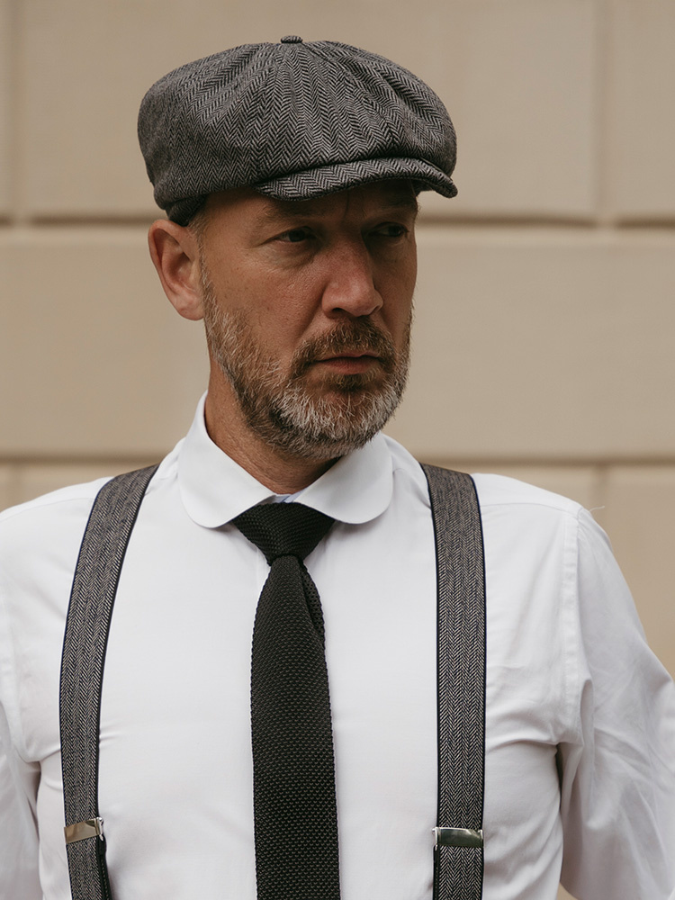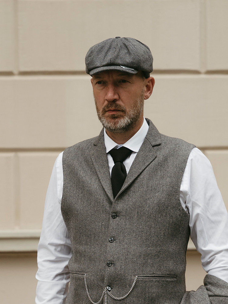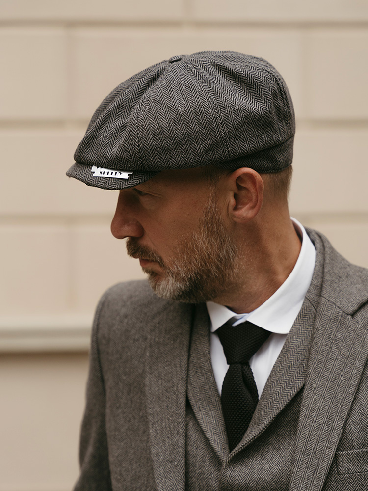 Que serait un Peaky Blinder sans sa casquette ? Le couvre-chef emblématique pourrait en fait être considéré comme le personnage principal de la série. Malgré leur richesse acquise, les Blinders s'accrochent à leurs casquettes plates en tweed de la classe ouvrière. Et pas seulement pour protéger ces superbes dessous de table du climat anglais typique, mais aussi parce que c'est l'arme parfaite grâce à la lame de rasoir cachée dans la crête.