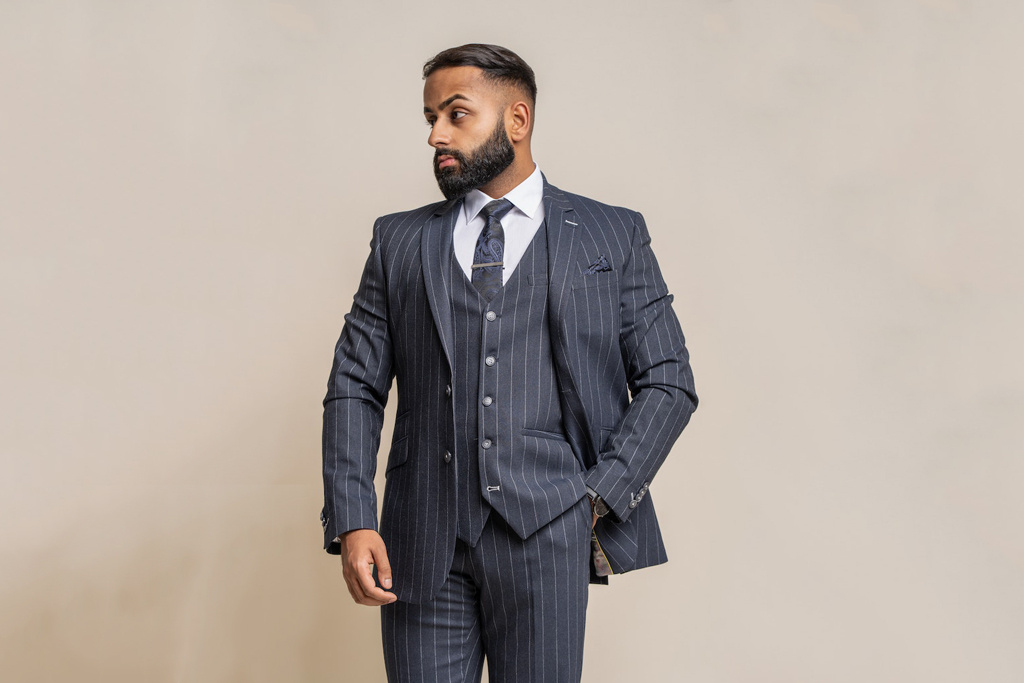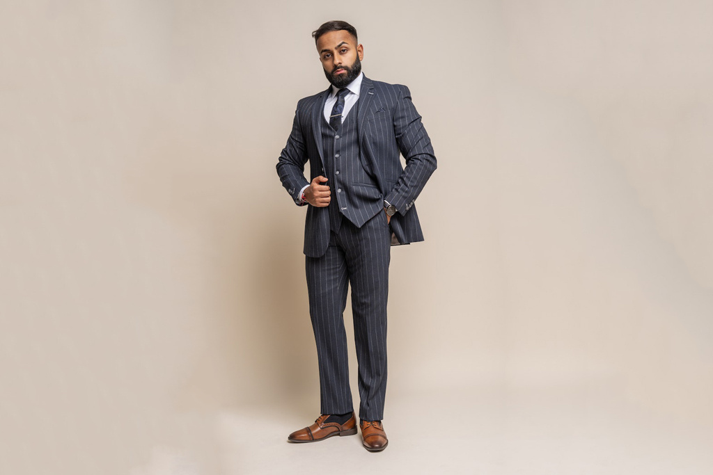 - Costume 3 pièces bleu marine rayé.