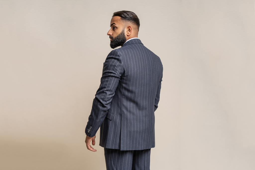 Les rayures frappantes ajoutent une touche subtile de distinction à cet ensemble classique. La couleur bleu profond donne au costume une allure contemporaine et le rend adapté à diverses occasions formelles et semi-formelles.